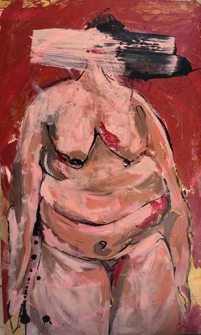 In Discomfort she uses a dynamic and expressive technique in which the subject of the work is not only indicated in the delineation of a recognisable figure but also in the manner of painting itself, between figuration and calligraphy passing through the Expressionism experiences of figures such as Georg Baselitz. An aggressive and explicit painting without being verbose tries to concretise in the material of the painting the theme of the position of women in contemporary society: a woman who has become aware of herself, proud and emancipated, but who still suffers compression, violence and censorship. The body in Discomfort turns red, invades the space, vanishes and disidentifies in the thrashed and nervous